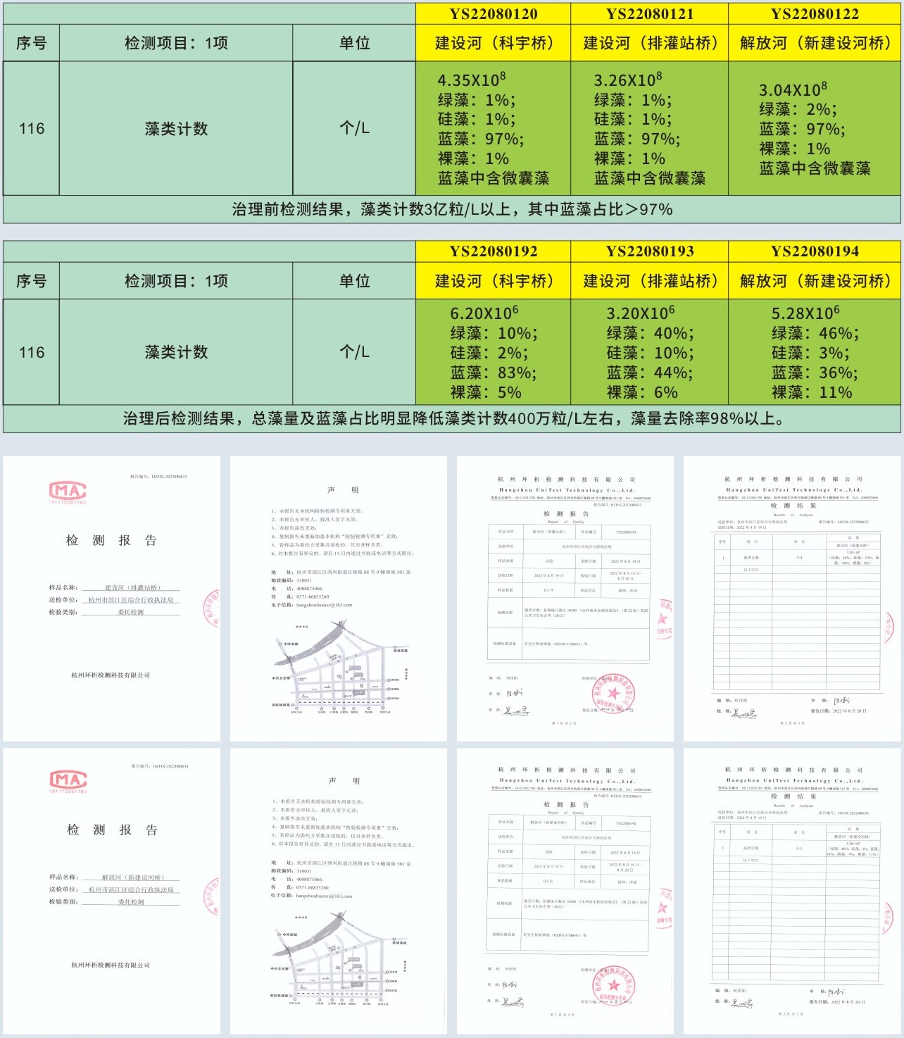 2022年8月3日,浙江清湖控股集團受杭州市濱江區城市河道保護管理中心、杭州市濱江區生態環境局邀請,針對區內建設河和解放河兩條河道爆發藍藻進行實地考察。清湖公司技術團隊對兩條河道進行了現場勘察及水質檢測后,制定了快治理方案,方案通過了相關部門審核并簽約,項目8月14日正式進場治理。